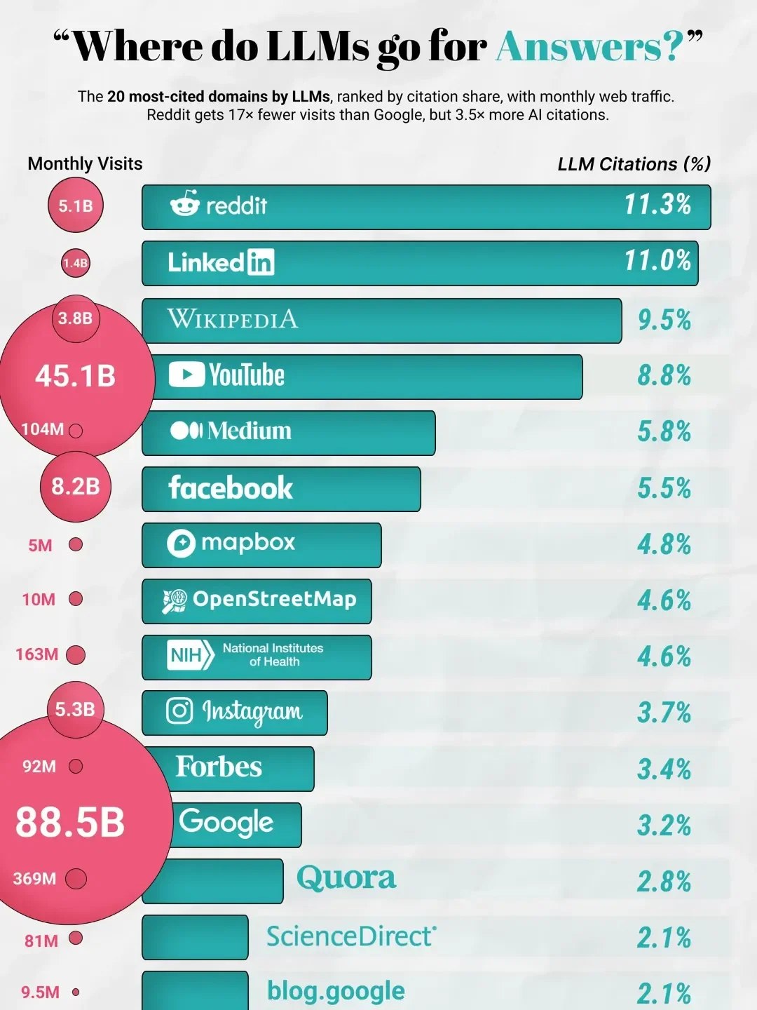 <AI가 답변할 때 가장 많이 참고하는 사이트 Top 15> 1. 레딧 : 11.3% 2. 링크드인 : 11.0% 3. 위키피디아 : 9.5% 4. 유튜브 : 8.8% 5. 미디엄 : 5.8% 6. 페이스북 : 5…