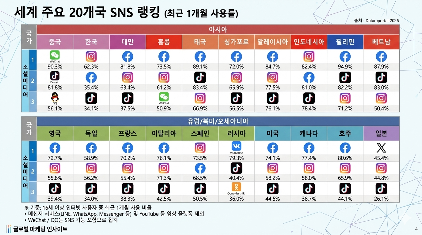 인플루언서/크리에이터를 통한 마케팅이 대세이죠. 각 국가별 SNS 사용 현황을 참고하세요~